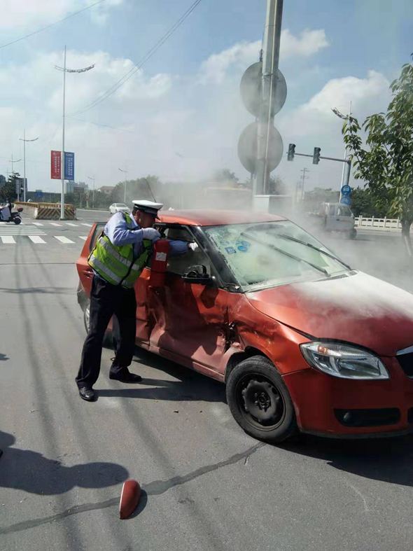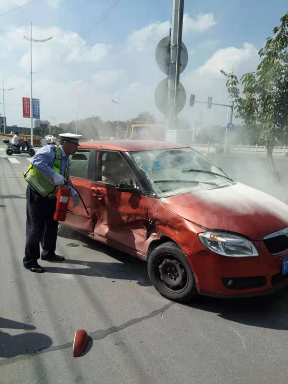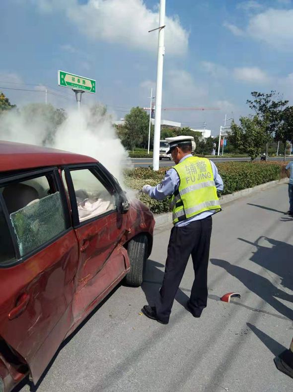 2019年9月17日上午我盾安保安公司派駐高新區(qū)交警大隊輔警隊員:林天云、鄧步華、鄭亞福三名隊員,在祥泰路與楊子灣路執(zhí)行路面違章整治,在上午9點40分發(fā)生交通事故,一輛蘇B852532與行駛蘇MFS672的紅色轎車相撞,使得紅色轎車突然起火,我公司隊員林天云、鄧步華、鄭亞福同志反應迅速,立即將警車上的滅火器取出進行滅火,最大限度的降低了起火車輛的損失。事后車主送出錦旗“英勇救火,為民解憂”以表感謝,公司領導對以上三名隊員滅火事件給予肯定和表揚,并進行嘉獎獎勵。