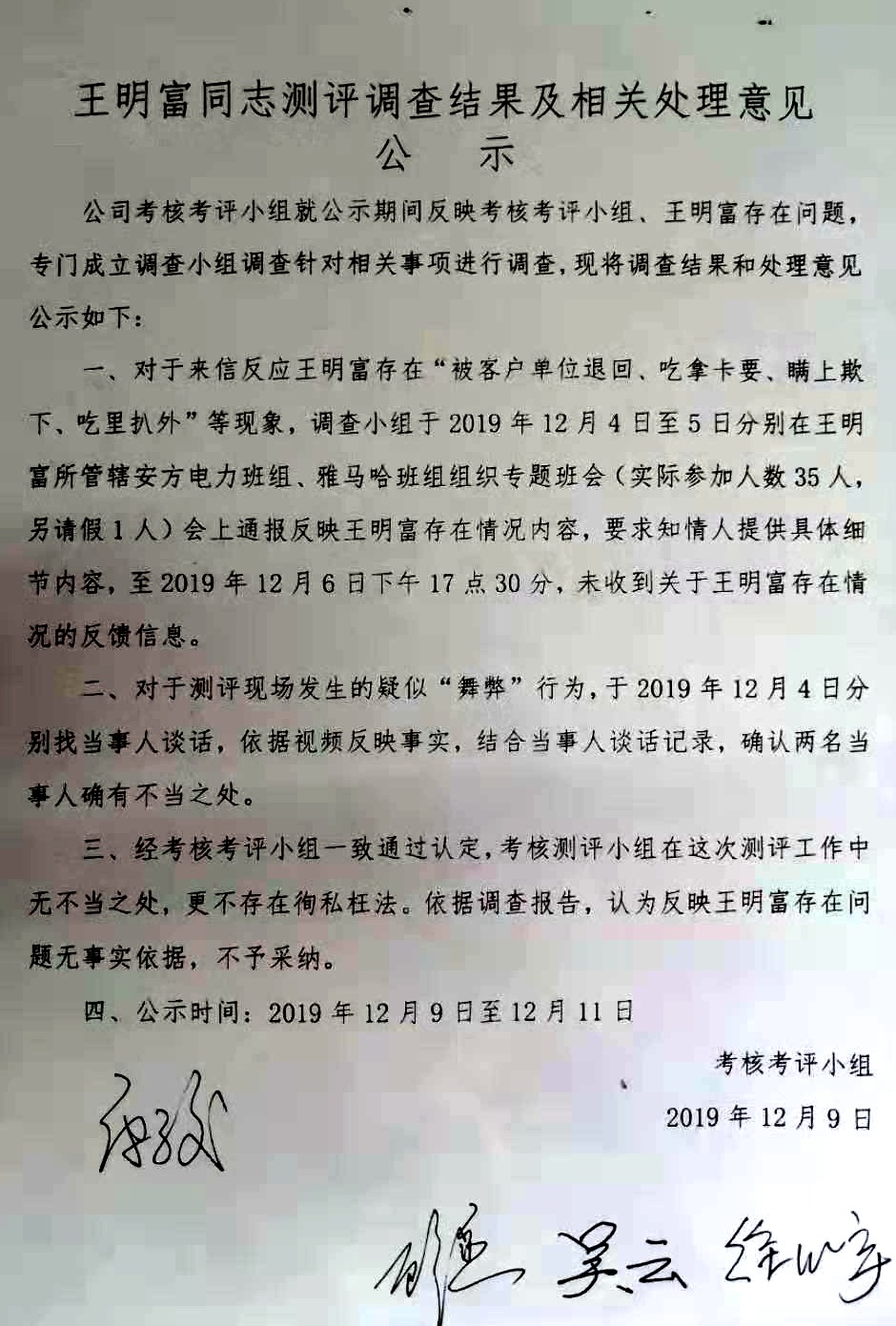 關(guān)于王明富同志測評調(diào)查結(jié)果及相關(guān)處理意見公示