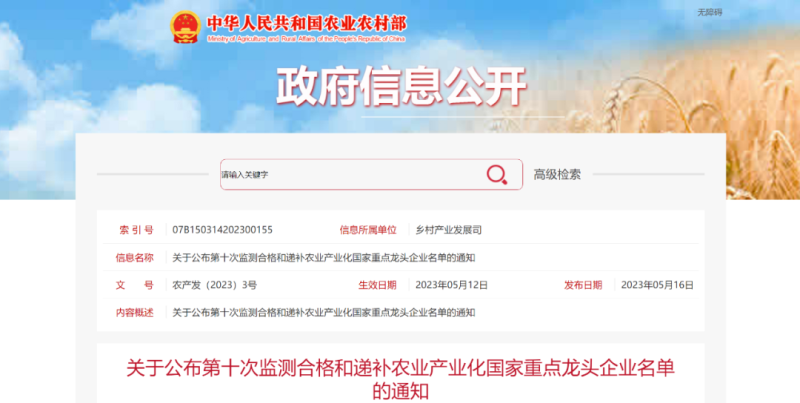 5月16日,農(nóng)業(yè)農(nóng)村部公布了第十次監(jiān)測合格和遞補農(nóng)業(yè)產(chǎn)業(yè)化國家重點龍頭企業(yè)名單。